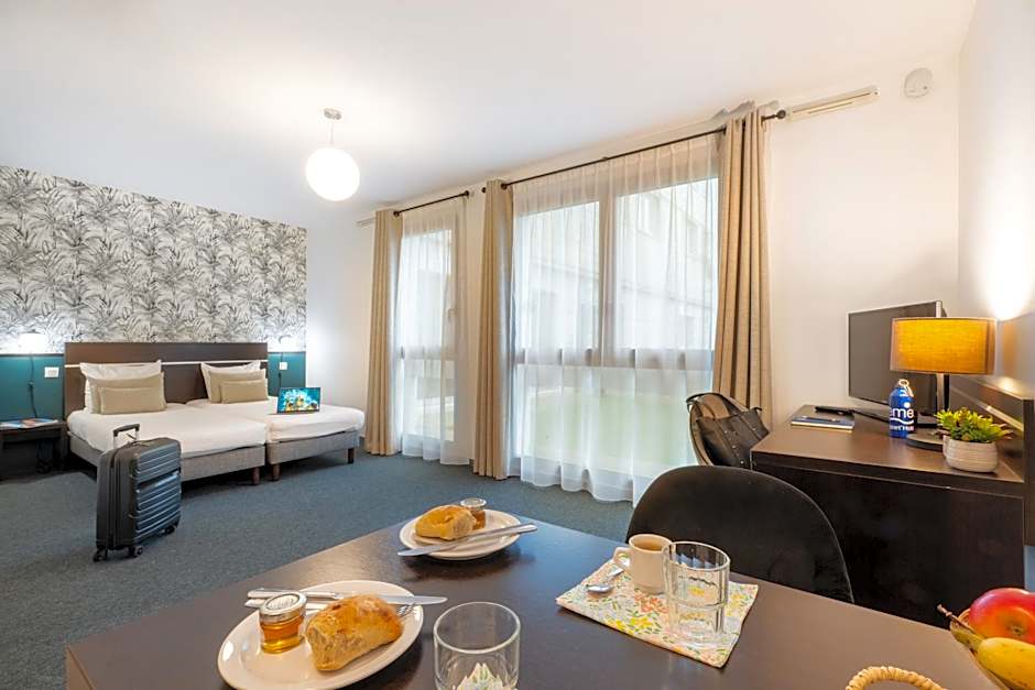 Most of these studios include a large double bed. They all have a kitchenette equipped with a refrigerator, a microwave oven, electric hob, a coffee maker, a toaster, a kettle, and kitchenware. There is a bathroom with shower and toilets. A flat-screen TV with satellite channels and Canal + is available as well as air-conditioning.